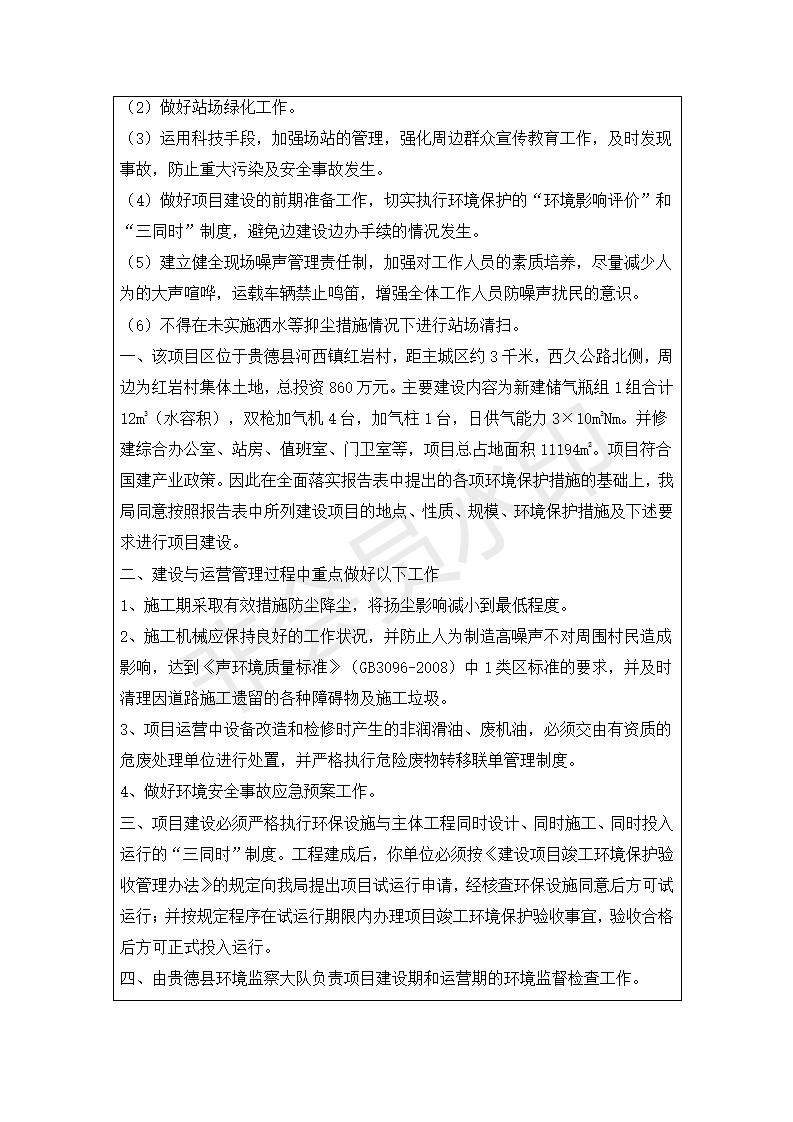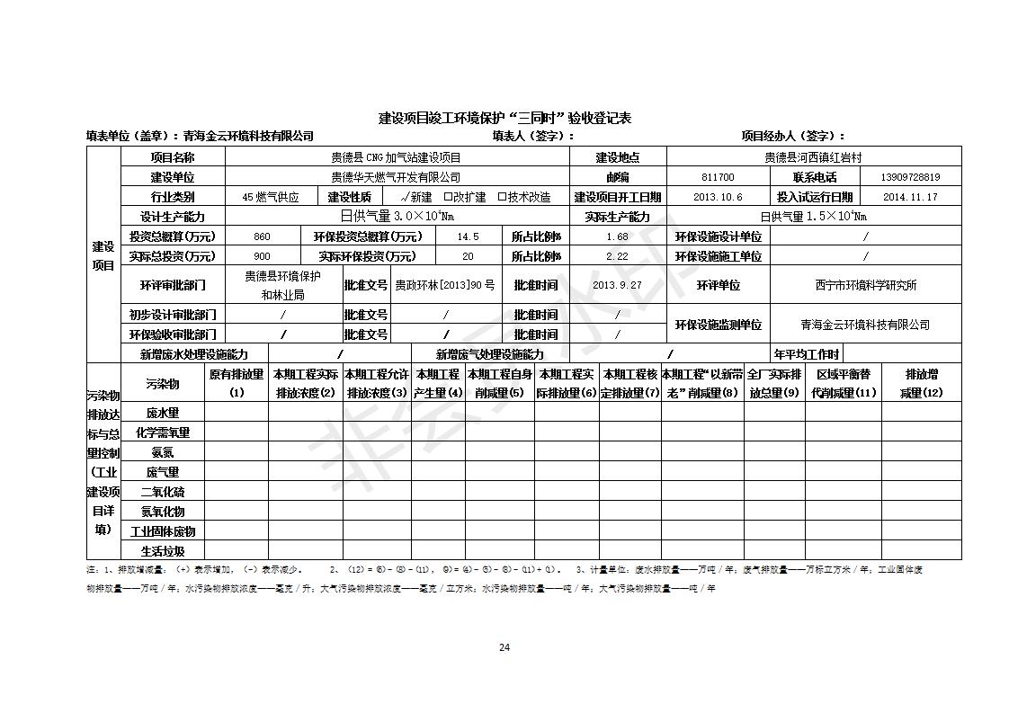 根據(jù)中華人民共和國(guó)務(wù)院令第682號(hào)《國(guó)務(wù)院關(guān)于修改〈建設(shè)項(xiàng)目環(huán)境保護(hù)管理?xiàng)l例〉的決定》和《建設(shè)項(xiàng)目竣工環(huán)境保護(hù)驗(yàn)收暫行辦法》(國(guó)務(wù)院令682號(hào)),青藏高原特色生物資源綠色開發(fā)工程研究中心建設(shè)項(xiàng)目竣工環(huán)境保護(hù)驗(yàn)收內(nèi)容(包括竣工環(huán)境保護(hù)驗(yàn)收調(diào)查報(bào)告和驗(yàn)收意見(jiàn))公示如下: 一、項(xiàng)目名稱:貴德縣CNG加氣站建設(shè)項(xiàng)目 二、地點(diǎn):貴德縣河西鎮(zhèn)紅巖村 三、建設(shè)單位:貴德華天燃?xì)忾_發(fā)有限公司 四、建設(shè)內(nèi)容:日供氣量為1.5×104Nm的加氣站 五、公示時(shí)間:二〇一九年五月二十九日至二〇一九年六月二十五日 六、聯(lián)系人:張工 公示期間,對(duì)上述公示內(nèi)容如有異議,請(qǐng)以書面形式反饋,個(gè)人須署真實(shí)姓名,單位須加蓋公章。
