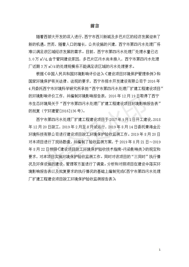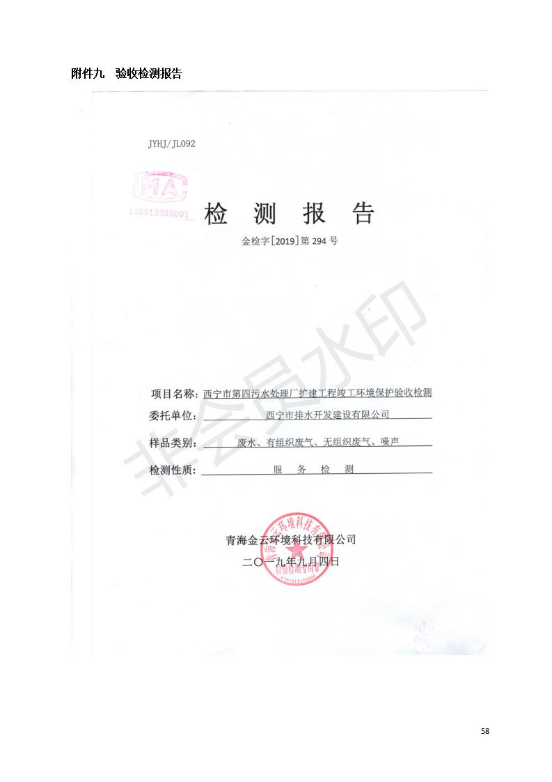 根據(jù)中華人民共和國國務(wù)院令第682號《國務(wù)院關(guān)于修改〈建設(shè)項目環(huán)境保護管理條例〉的決定》和《建設(shè)項目竣工環(huán)境保護驗收暫行辦法》(國務(wù)院令682號),西寧市第四污水處理廠擴建工程建設(shè)項目(包括竣工環(huán)境保護驗收監(jiān)測報告表和驗收意見)公示如下。 一、項目名稱:西寧市第四污水處理廠擴建工程建設(shè)項目 二、地點:五四西路南側(cè),原西寧市第四污水處理廠西側(cè)用地 三、建設(shè)單位:西寧市排水開發(fā)建設(shè)有限公司 四、建設(shè)內(nèi)容:第四污水處理廠擴建工程五、聯(lián)系人:張工 六、聯(lián)系電 話:0971-6515411 七、公示時間:二〇一九年九月十七日至二〇一九年十月十八日公示期間,對上述公示內(nèi)容如有異議,請以書面形式反饋,個人須署真實姓名,單位須加蓋公章。