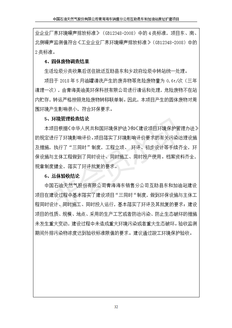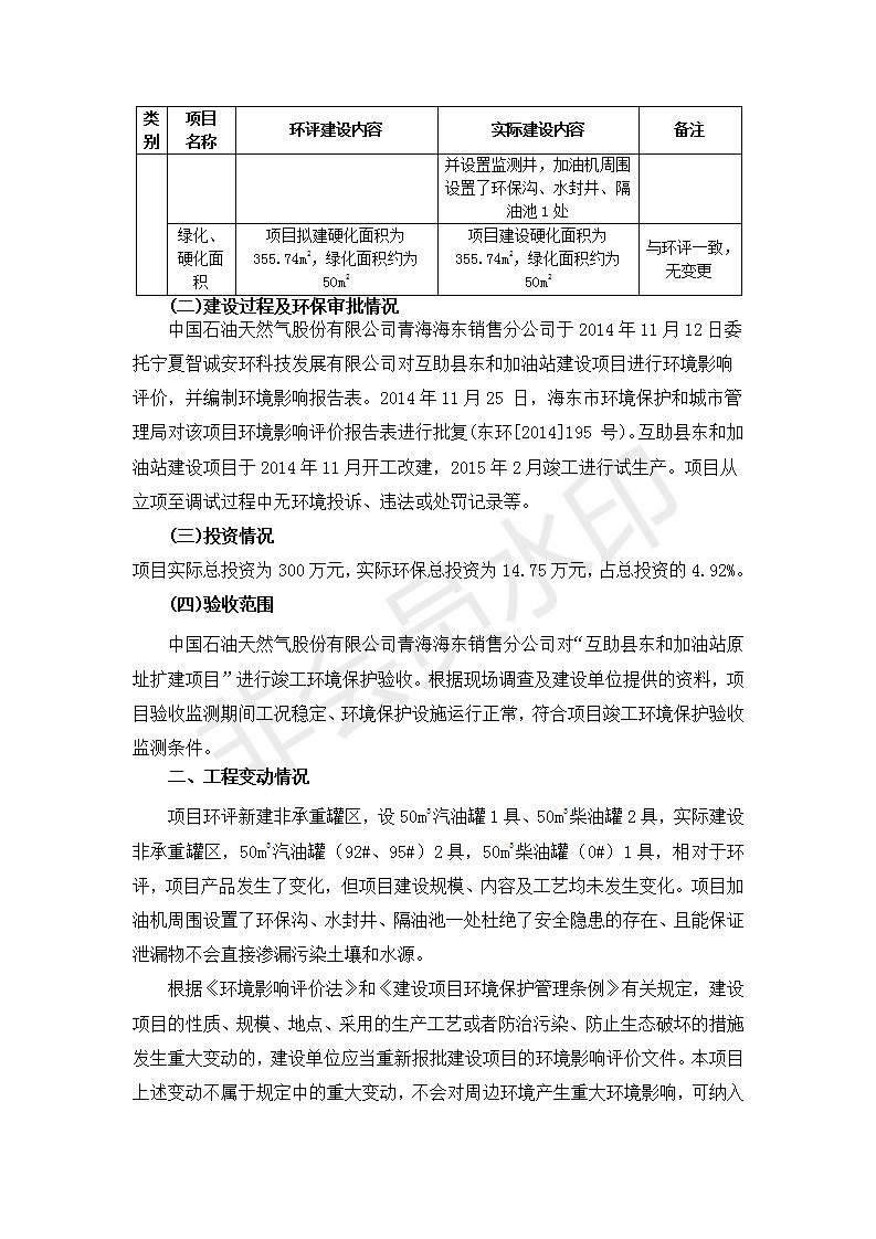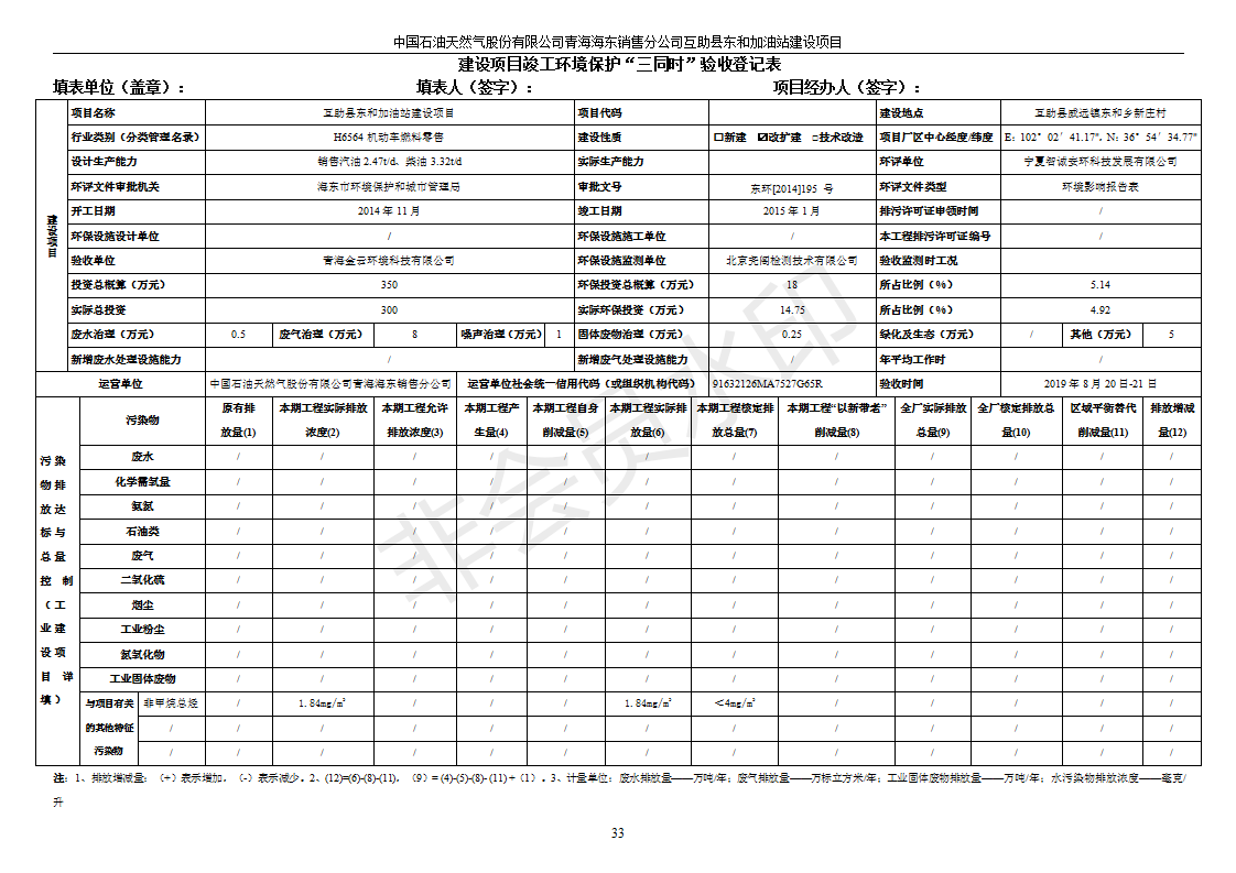 根據(jù)中華人民共和國(guó)國(guó)務(wù)院令第682號(hào)《國(guó)務(wù)院關(guān)于修改〈建設(shè)項(xiàng)目環(huán)境保護(hù)管理?xiàng)l例〉的決定》和《建設(shè)項(xiàng)目竣工環(huán)境保護(hù)驗(yàn)收暫行辦法》(國(guó)務(wù)院令682號(hào)),互助縣東和加油站原址擴(kuò)建項(xiàng)目(包括竣工環(huán)境保護(hù)驗(yàn)收監(jiān)測(cè)報(bào)告表和驗(yàn)收意見(jiàn))公示如下。 一、項(xiàng)目名稱:互助縣東和加油站原址擴(kuò)建項(xiàng)目 二、地點(diǎn):互助縣威遠(yuǎn)鎮(zhèn)東和鄉(xiāng)新莊村 六、聯(lián)系電話:0971-6515411 七、公示時(shí)間:二〇一九年九月二十七日至二〇一九年十月二十九日 公示期間,對(duì)上述公示內(nèi)容如有異議,請(qǐng)以書面形式反饋,個(gè)人須署真實(shí)姓名,單位須加蓋公章。