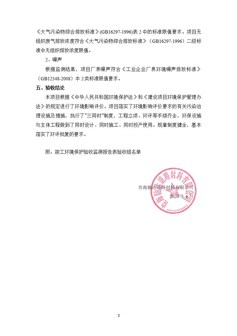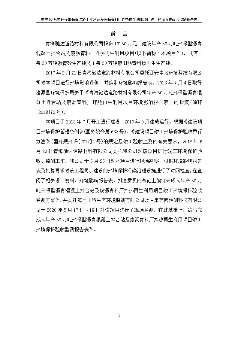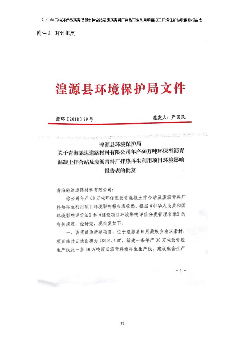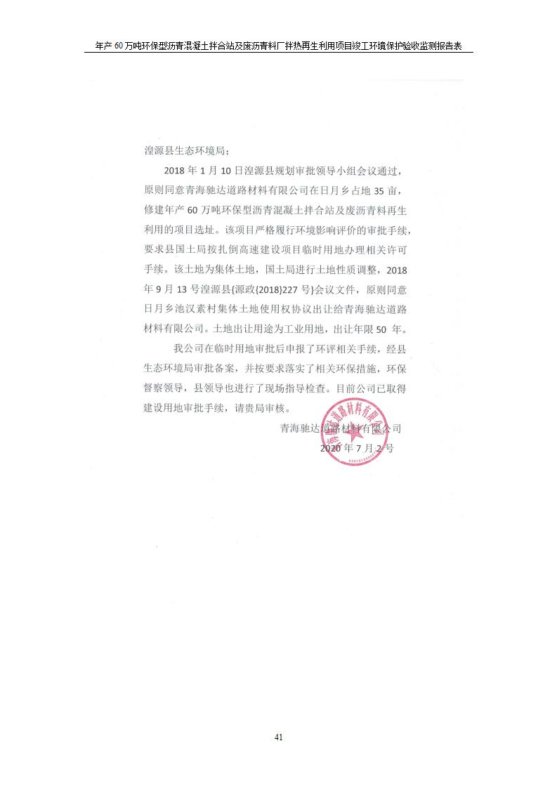 根據(jù)中華人民共和國國務(wù)院令第682號《國務(wù)院關(guān)于修改〈建設(shè)項(xiàng)目環(huán)境保護(hù)管理?xiàng)l例〉的決定》和《建設(shè)項(xiàng)目竣工環(huán)境保護(hù)驗(yàn)收暫行辦法》(國務(wù)院令682號),青海馳達(dá)道路材料有限公司年產(chǎn)60萬噸環(huán)保型瀝青混凝土拌合站及廢瀝青料廠拌熱再生利用項(xiàng)目竣工環(huán)境保護(hù)驗(yàn)收監(jiān)測報(bào)告表公示如下。 一、項(xiàng)目名稱:年產(chǎn)60萬噸環(huán)保型瀝青混凝土拌合站及廢瀝青料廠拌熱再生利用項(xiàng)目竣工環(huán)境保護(hù)驗(yàn)收監(jiān)測報(bào)告表 二、地點(diǎn):湟源縣日月藏族鄉(xiāng)池漢素村 三、建設(shè)單位:青海馳達(dá)道路材料有限公司 四、建設(shè)內(nèi)容:本項(xiàng)目共有2條瀝青砼生產(chǎn)線及1條穩(wěn)定土生產(chǎn)線,配套辦公樓等。 五、聯(lián)系人:楊工 六、聯(lián)系電 話:0971-6515411 七、公示時(shí)間:二〇二〇年七月六日至二〇二〇年七月三十一日 公示期間,對上述公示內(nèi)容如有異議,請以書面形式反饋,個(gè)人須署真實(shí)姓名,單位須加蓋公章。